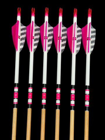 These arrows are made out of Surewood Shafts Doug Fir premiums. They are 5/16" in diameter. They are spined at 40-45 pounds and weigh 380-390 grains.